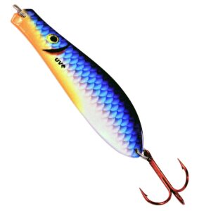 Introducing the new Ultra Violet Doctor Spoons featuring the latest in Imaging Technology and Innovative Ultra Violet finishes. It’s unique design allows these spoons to be fished at almost any speed with deadly results. This double action spoon allows you to attach the hook to the large end for a wide sweeping action and mid-depth running. Tie it to the narrow end for deep, low trolling and tight wobbling action. These spoons come equipped with heavy duty split-rings and Eagle Claw (razor sharp) 3/0 hooks. Ultra Violet Doctor Spoons are available in 8 spectacular colors and comes in two sizes: P275 (5/8 oz.) and P285 (1 3/16 oz.) to catch almost all species of fresh and salt water game fish.